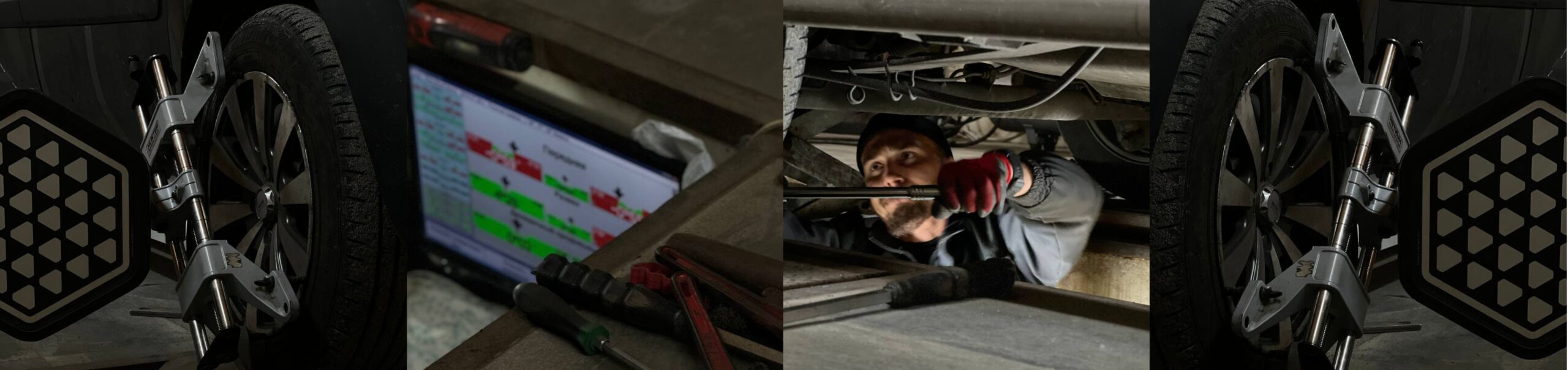 Перед початком роботи майстер перевіряє стан підвіски: люфти, сайлентблоки, наконечники, шарові опори.